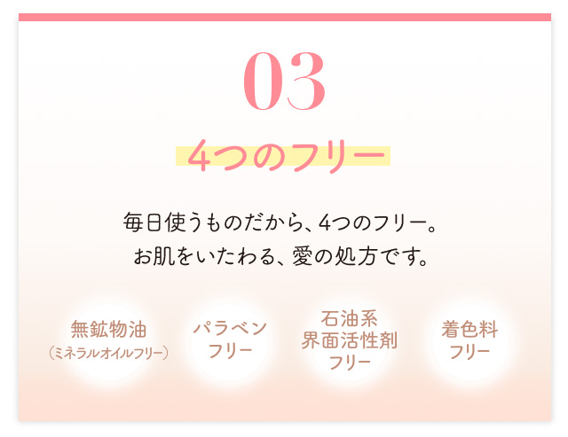 03 4つのフリー 毎日使うものだから、4つのフリー。お肌をいたわる、愛の処方です。無鉱物油(ミネラルオイルフリー) パラベンフリー 石油系界面活性剤フリー 着色料フリー