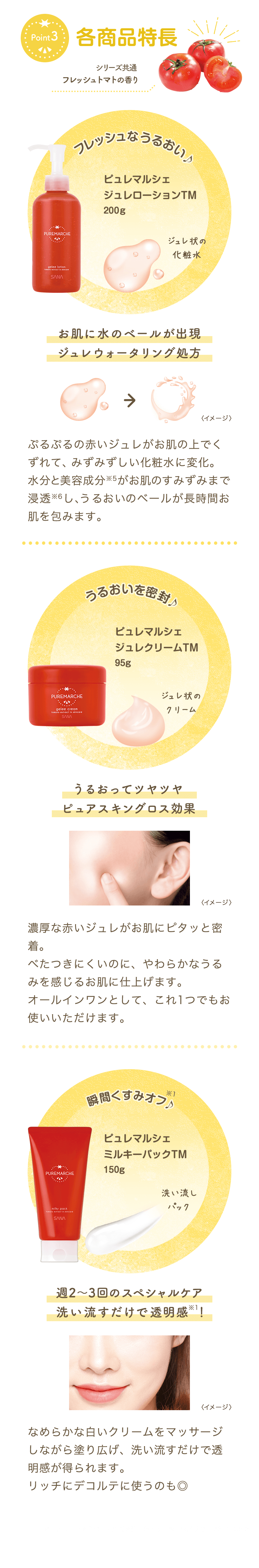 point3 各商品特長 ピュレマルシェ ジュレローションTM 200g お肌に水のベールが出現 ジュレウォータリング処方 ぷるぷるの赤いジュレがお肌の上でくずれて、みずみずしい化粧水に変化。 水分と美容成分※5がお肌のすみずみまで浸透※6し、うるおいのベールが長時間お肌を包みます。 ピュレマルシェ ジュレクリームTM 95g うるおってツヤツヤ ピュアスキングロス効果 濃厚な赤いジュレがお肌にピタッと密着。べたつきにくいのに、やわらかなうるみを感じるお肌に仕上げます。 オールインワンとして、これ1つでもお使いいただけます。 ピュレマルシェ ミルキーパックTM 150g 週2~3回のスペシャルケア 洗い流すだけで透明感 ! なめらかな白いクリームをマッサージしながら塗り広げ、洗い流すだけで透明感が得られます。リッチにデコルテに使うのも◎
